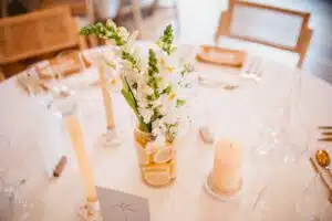 Bij Ateljee Boekee draait alles om bloemen die niet alleen mooi zijn, maar ook een verhaal vertellen. Met een creatieve twist en een vleug speelsheid werden bloemen voor dit huwelijk tot leven gewerkt op de dinertafel van de tennisclub.